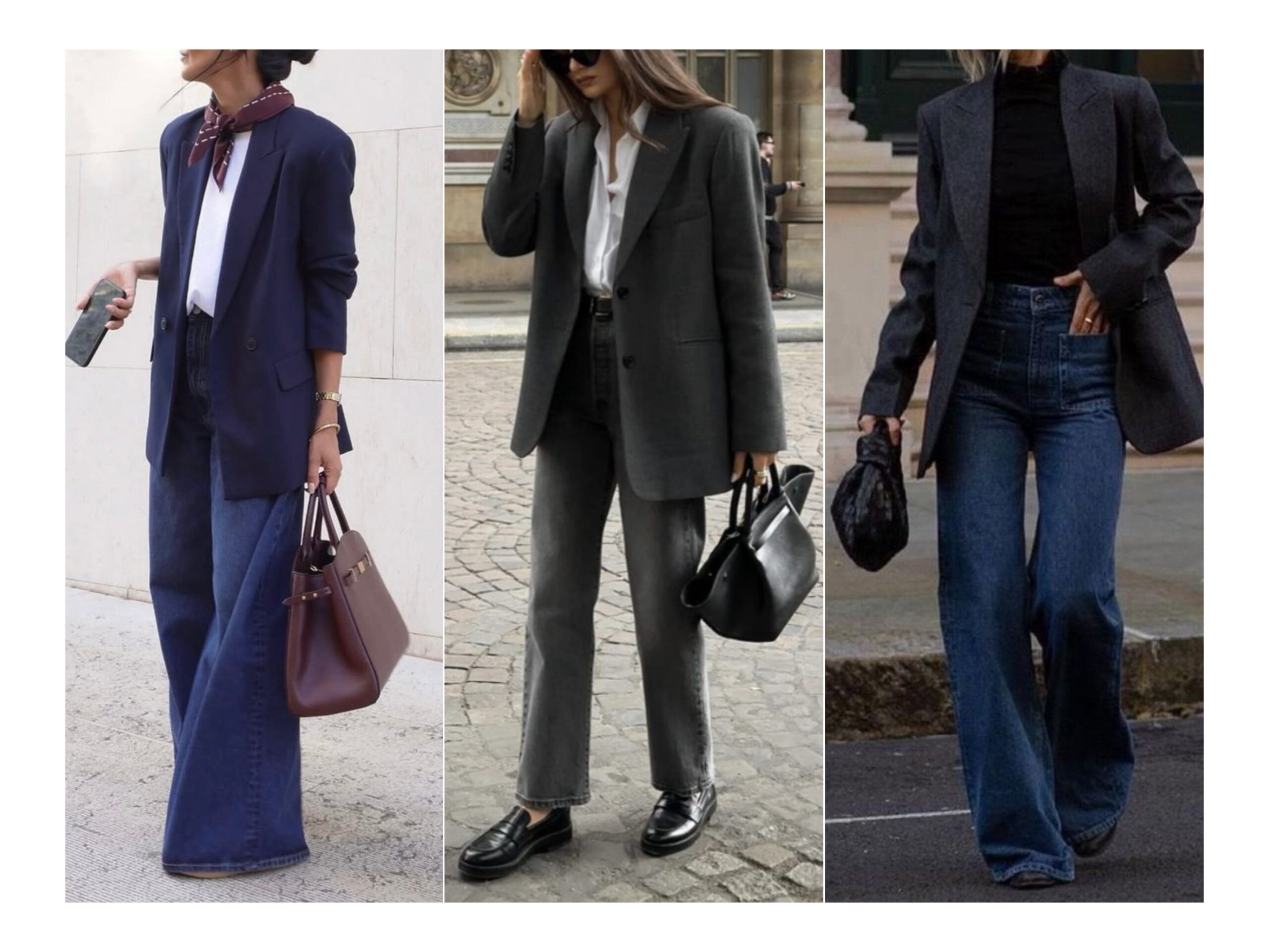La fel de bine poți purta un sacou cu o pereche de pantaloni din denim (bleumarin sau negru), drepți sau ușor evazați; cu condiția ca aceștia să nu aibă niciun fel de decolorări sau rupturi.